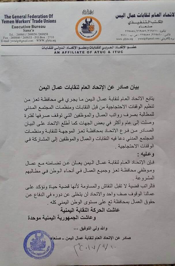 أعلن الاتحاد العام لنقابة عمال اليمن تضامنه مع عمال وموظفي محافظة تعز ومع جميع عمال الجمهورية المتوقفة رواتبهم منذ عام في مطالبهم المشروعة بصرف مرتباتهم.
