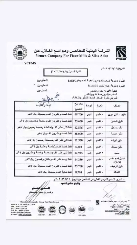 وبحسب وثيقة رسمية صادرة عن الشركة بتاريخ اليوم الثلاثاء عن بيع دقيق السنابل عبوة 50 كيلو بـ 25700 ريال ، بعد ان وصل أواخر الشهر الماضي الى نحو 45 الف ريال.