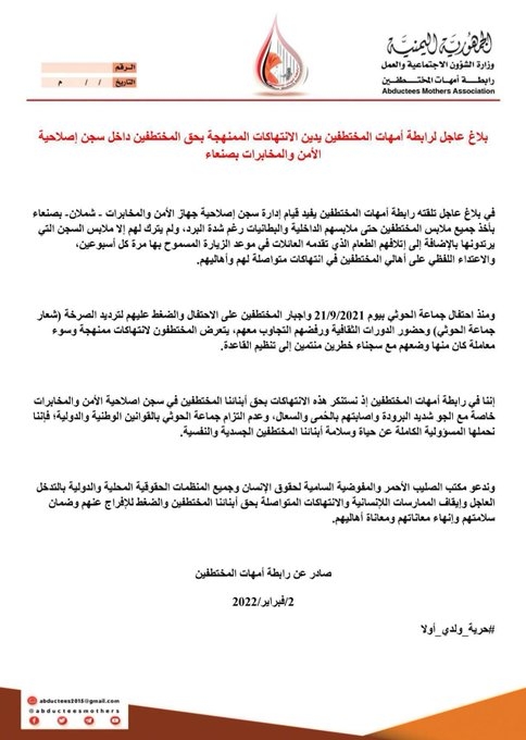 أدانت رابطة أمهات المختطفين اليمنيين، مليشيا الحوثي الانقلابية لانتهاكاتها وممارساتها اللاإنسانية بحق المختطفين في سجن الأمن والمخابرات بمنطقة شملان صنعاء.