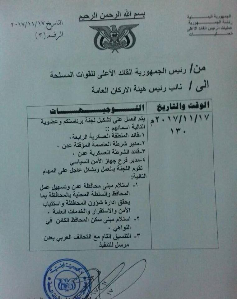 ووجه الرئيس هادي نائب رئيس هيئة الأركان اللواء صالح الزنداني بتشكيل لجنة عسكرية برئاسته وعضوية قائد المنطقة العسكرية الرابعة ومدير امن عدن وقائد الشرطة العسكرية ومدير فرع جهاز الامن السياسي .