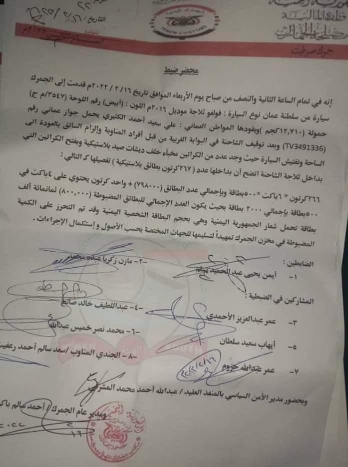 ضبط 800 ألف بطاقة هوية تحمل شعار الجمهورية قادمة من سلطنة عمان في المهرة- وثيقة