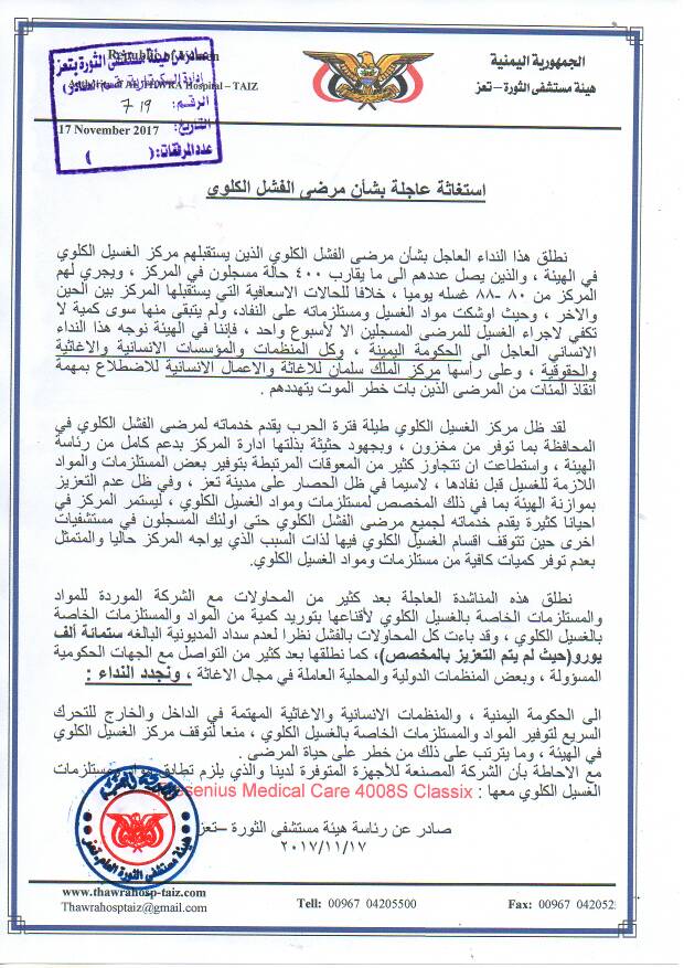 أطلقت هيئة مستشفى الثورة بتعز نداء استغاثة عاجل تحذر فيه من نفاذ المواد الخاصة بغسيل الكلى.