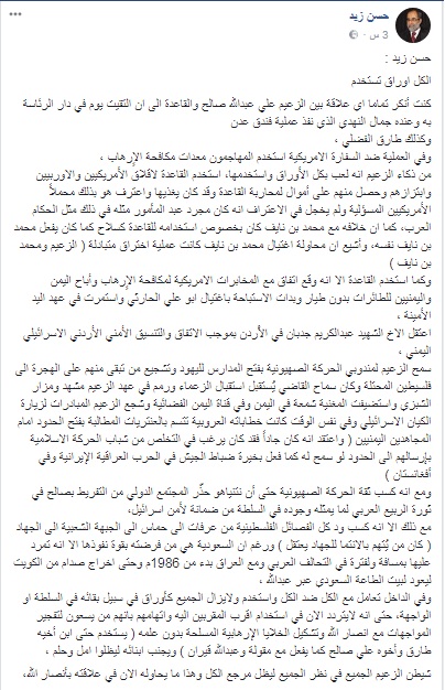 في أعنف هجوم حوثي على المخلوع ، نشر القيادي الحوثي حسن زيد منشورا على صفحته على الفيس بوك اتهمه فيه صالح بصناعة الارهاب في اليمن.