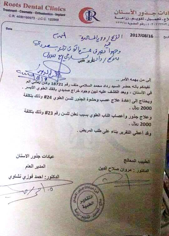 ورغم ان التقرير المقدم من احد عيادات الاسنان في السعودية يوضح بأن تكاليف العلاج لا تتجاوز مبلغ 4 الف ريال سعودي ، الا أن بن دغر وجه بصرف مبلغ 10 الف ريال سعودي.