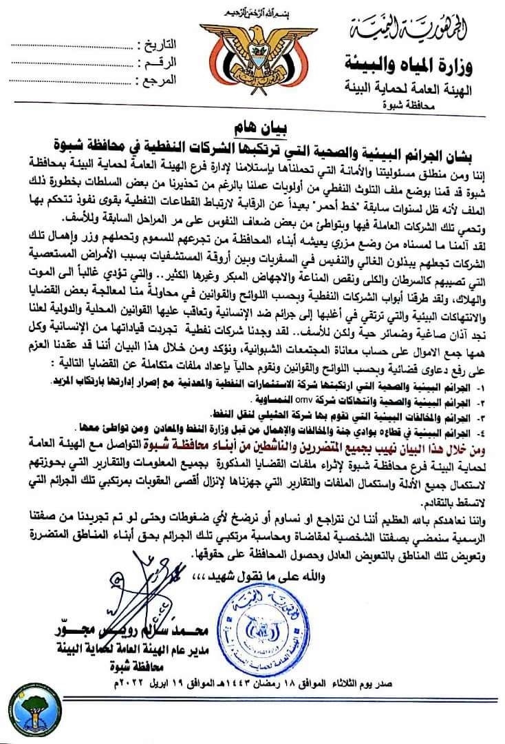 هيئة حماية البيئة بشبوة تتهم الشركات النفطية بارتكاب جرائم ضد الانسانية وتهدد بمقاضاتها – وثيقة