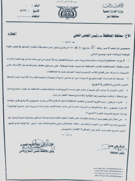 كشفت وثائق رسمية حصل عليها "الرصيف برس" عن انزعاج كبير لوكيلي محافظة تعز عارف جامل وعبدالكريم الصبري ضد قرار للمحافظ ينص على إعادة توزيع مهام الوكلاء.