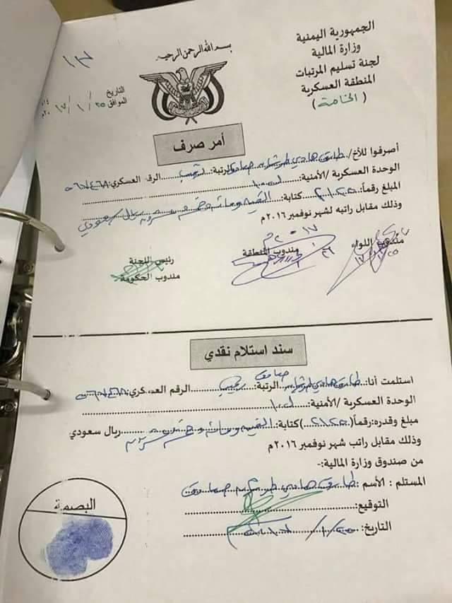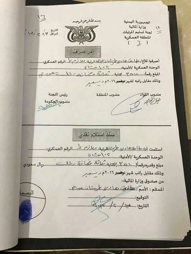 وكشفت الوثائق وهي أوامر صرف لمرتبات الجيش الوطني ، عن صرف مرتبات لنجل المحافظ برتبة ملازم أول في شهر نوفمبر وراتب في الشهر التالي ديسمبر برتبة رقيب .