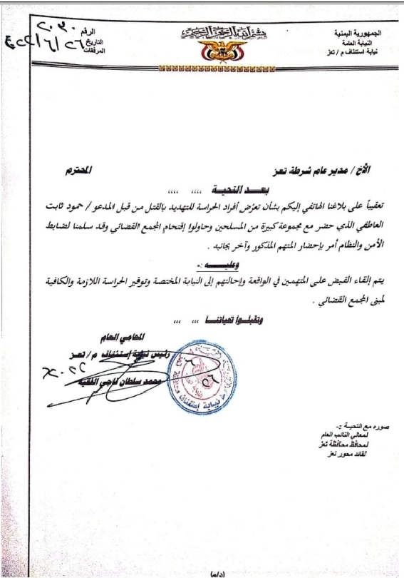 وطالب رئيس النيابة من شرطة تعز سرعة القبض على المتهمين وإحالتهم إلى النيابة مع توفير الحراسة اللازمة والكافية لحماية مبنى المجمع القضائي.