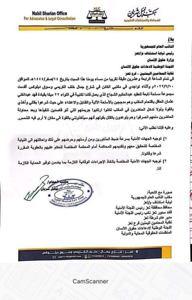 مسلحون يتبعون قيادي إخواني بمحور تعز يقتحمون مكتب محامي ويهددون باختطافه وقتله- وثيقة