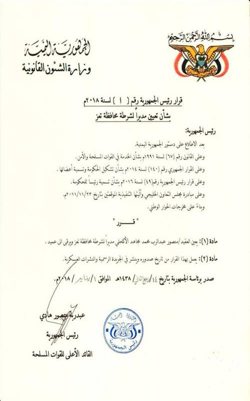 اصدر الرئيس عبد ربه منصور هادي قرراً جمهورياً قضى بتعيين مدير للأمن في تعز، خلفا للعميد محمد المحمودي.