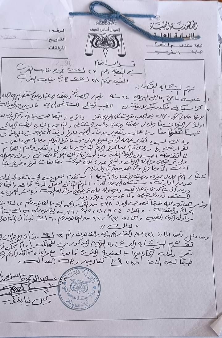 تعز .. النيابة تحيل مدير مستشفى خاص وطبيب أجنبي للمحاكمة - وثيقة
