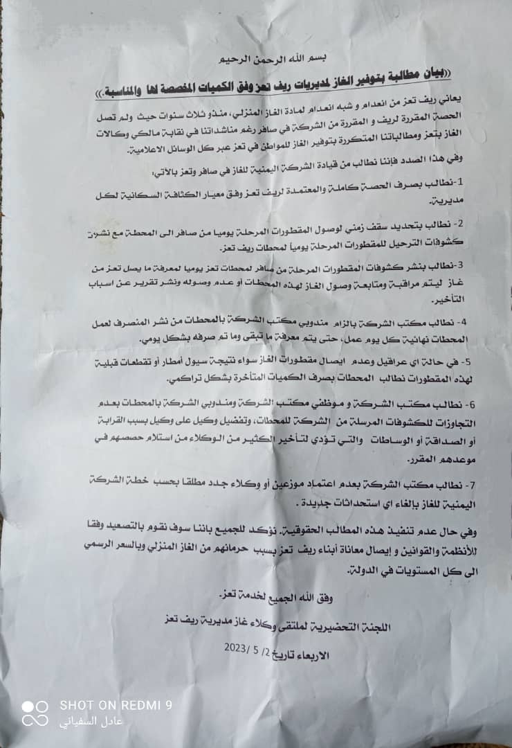 وتاتي الاحتجاجات بعد التلاعب بحصة الموزعين وحرامان مواطنين في ريف تعز من حصتهم من الغاز المنزلي، من قبل مسؤولي شركة الغاز بمحافظة تعز..