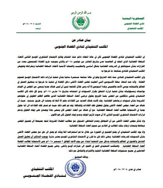 دعا نادي القضاة الجنوبي الى تعليق العمل الشامل والمفتوح في المحاكم والنيابات ابتداءً من اليوم الأحد 9 ديسمبر 2018م حتى الاستجابة لمطالب القضاة أعضاء السلطة القضائية.