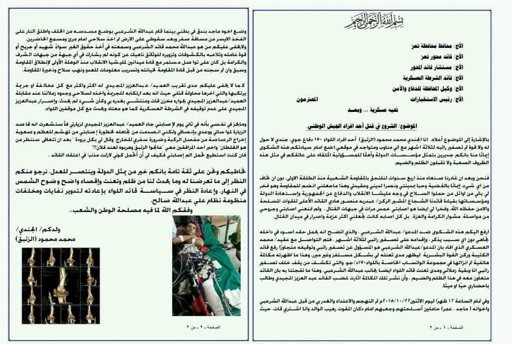 "الزئبق" جندي في اللواء 170 دفاع جوي يتهم قائده بالتستر على مجرم أصابه بطلق ناري "وثائق"