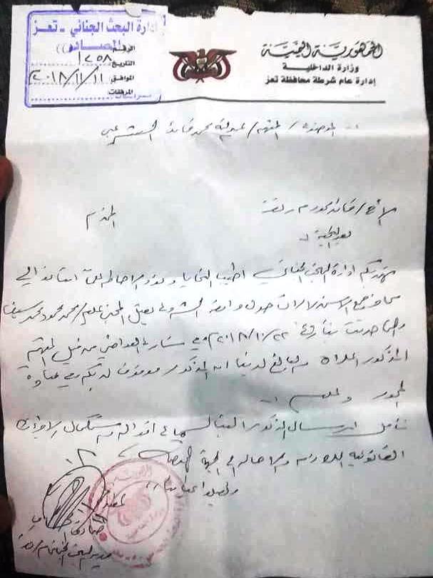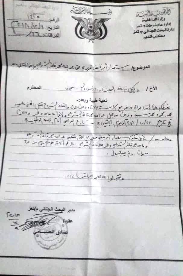 وتفيد المعلومات أن الجاني ”عبدالله الشرعبي ” هو من اقارب العميد عبدالعزيز المجيدي قائد اللواء 170 دفاع جوي، ويعمل الجاني منذ 4 أشهر نائب ركن القوة البشرية في اللواء نفسه.