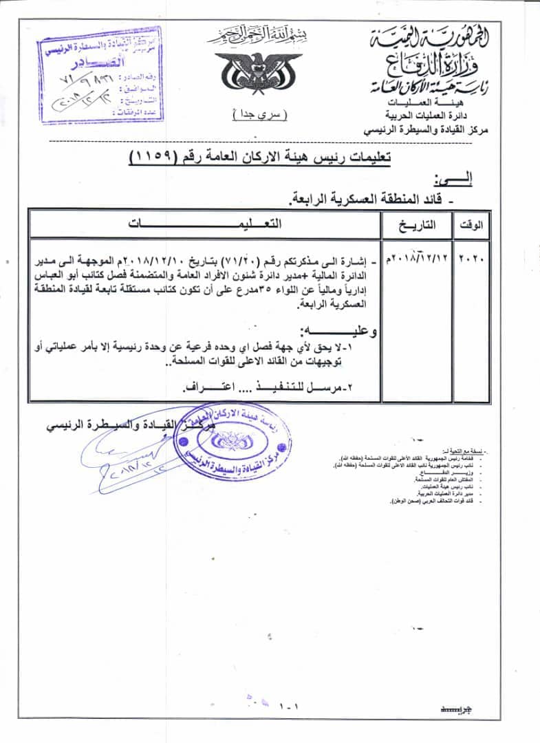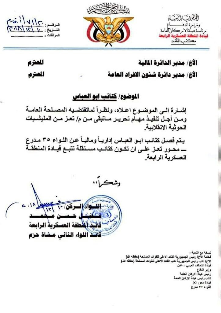 وقضى التوجيه بفصل كتائب أبو العباس عن اللواء 35 مدرع، في وقت تفيد المعلومات بتوجه لتشكيل الكتائب في لواء مستقل بتعز.