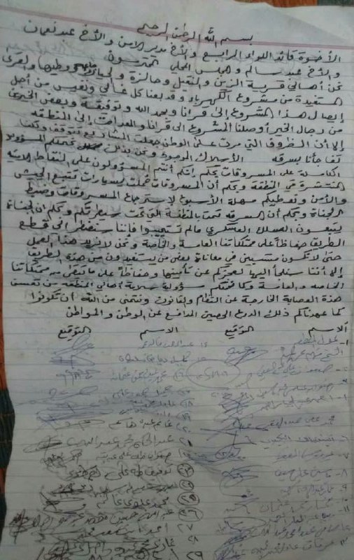 الأهالي وفي رسالة لهم الى قائد اللواء الرابع مشاة جبلي طالبوا فيها بسرعة عودة المنهوبات اليهم ، مهددين بقطع الطريق العام في حالة عدم حدوث ذلك.