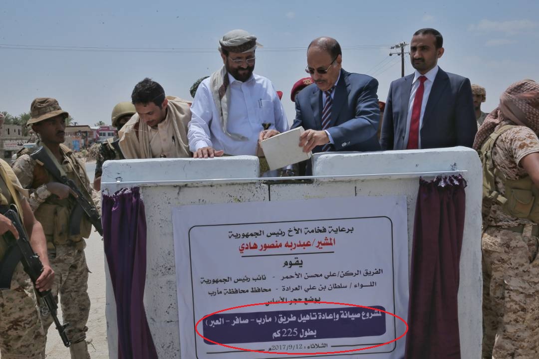 ففي منتصف شهر سبتمبر من عام 2017م وضع نائب رئيس الجمهورية علي محسن صالح ومعه محافظ مأرب سلطان العراده حجر الأساس لمشروع بمليارات الريالات لصيانة وإعادة تأهيل الطريق.