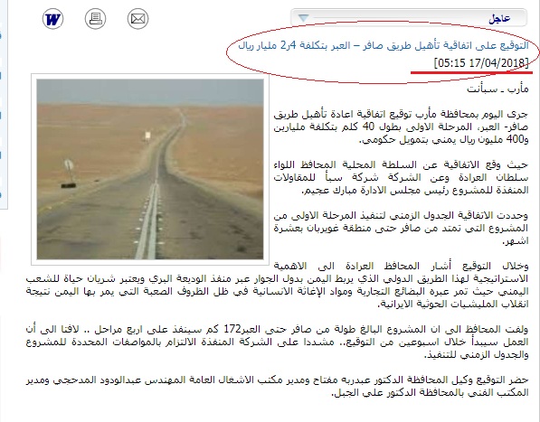 وفي منتصف شهر إبريل الماضي وقع المحافظ اتفاقية المرحلة الأولى من اعادة تأهيل طريق صافر- العبر، بطول 40 كلم بتكلفة مليارين و400 مليون ريال يمني.