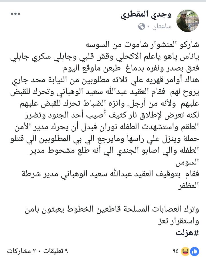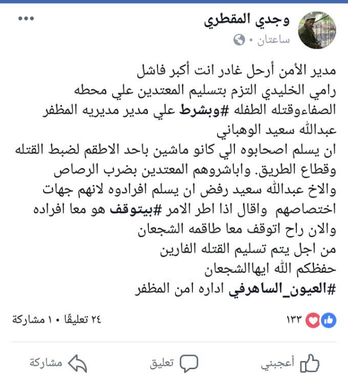 الناشط وجدي المقطري كشف في منشور له على صفحته على الفيس بوك عن خلفية هذا الاحتجاز ، مؤكدا بانه تم بناء على رغبة القتلة التي انصاع لها مدير الأمن.