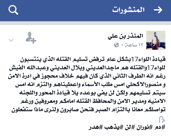 موضحا بانهم قاموا بتسليم أسماء القتلة من المسلحين الى مدير الأمن منصور الأكحلي الذي التزم لهم بالقبض عليهم ، مشيرا بأن ذلك لم يتم حتى الآن .