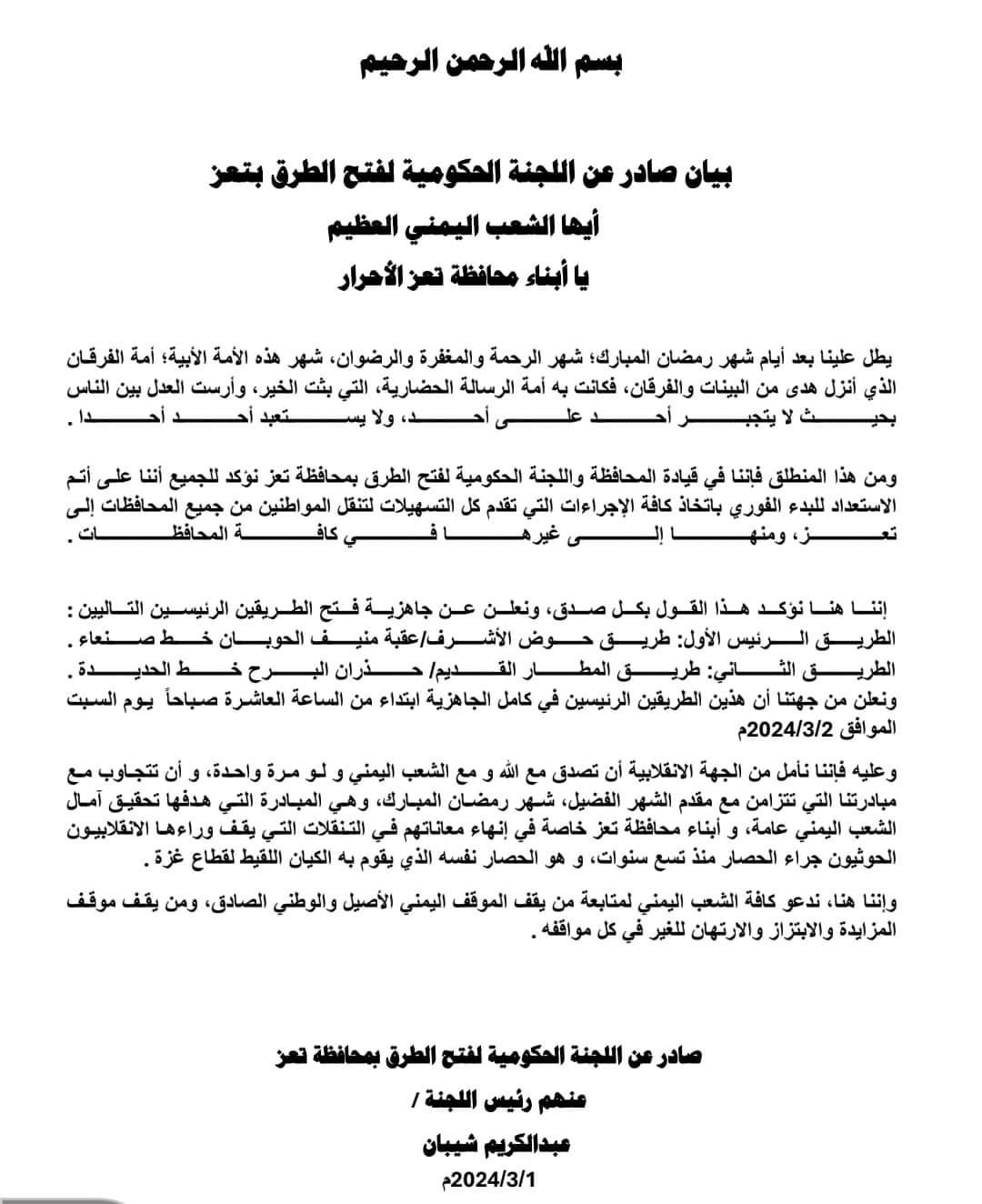 اعلنت ️اللجنة الحكومية لفتح الطرق بتعز عن جاهزية طريقين رئيسين بشكل كامل إبتداء الساعة العاشرة من يوم غداً السبت الموافق 2 مارس 2024م .