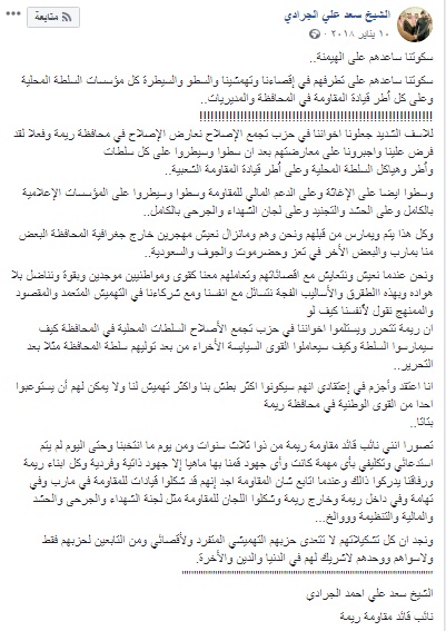 شن نائب قائد المقاومة في محافظة ريمة الشيخ سعد علي الجرادي هجوما عنيفا على حزب الاصلاح على خلفية ممارسات اقصائية لعناصره.