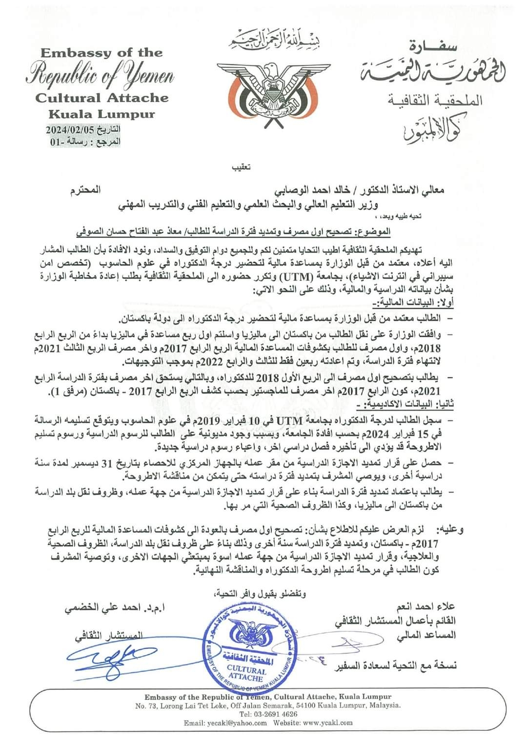 وتشير المذكرة المرفوعة من الملحقية الثقافية في ماليزيا لوزارة التعليم العالي أن الطالب استكمل متطلبات الدراسة ولم يتبقى له سوى مناقشة الرسالة حيث تتطلب المناقشة دفع الرسوم الدراسية ورسوم المناقشة والتي تتضاعف مع الوقت ودخول فصول دراسية جديدة.