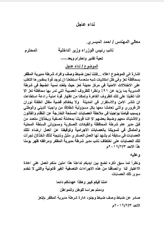 هذا الانتقام الذي تمارسه مليشيات الاصلاح دفع بافراد وضباط القسم الى توجيه نداء عاجل الى وزير الداخلية اللواء / احمد الميسري ، شرحوا فيها ما يتعرضون له من انتقام بسبب إداء واجبهم الأمني.