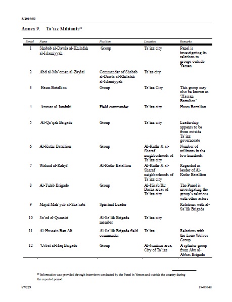 وأورد التقرير سردا لهذه المجموعات في كشف تفصيلي في ملحقه مع اسماء قياداتها، أغلبها قيادات موالية لحزب الاصلاح في تعز.