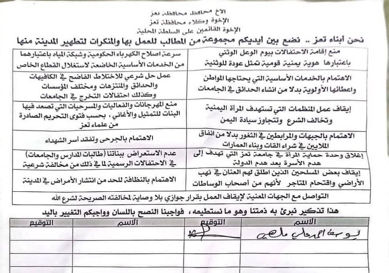 في تأكيد لحديث المخلافي الذي يعمل ناشطا في المجال الإنساني، قال مصدر أمني، فضل عدم كشف هويته لـ"العين الإخبارية" إن "الأجهزة الأمنية في تعز تلقت بالفعل أكثر من بلاغ من مواطنين عن انتشار عناصر متشددة تقوم بجمع توقيعات على عريضة عليها عدد من المطالب والقيود المتشددة من بينها الحض على طرد المنظمات وتقيد الحريات خاصة ضد المرأة ومنع الاختلاط في أماكن عامة".