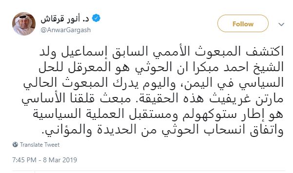 قال أنور بن محمد قرقاش وزير الدولة للشؤون الخارجية الإماراتي، الجمعة، إن المبعوث الأممي مارتن جريفيت، أدرك مؤخرا حقيقة أن مليشيا الحوثي الانقلابية تعرقل الحل السياسي في اليمن.