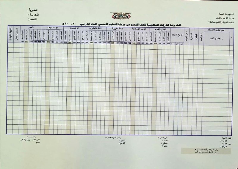 وأرفق القرار بتعميم يتضمن نموذج لكشف احتساب الدرجات وكيفية توزيعها ، وعتباراً من العام الدراسي الحالي؛ سيكون المعدل التحصيلي لاختبارات نهاية مرحلة التعليم الأساسي على النحو التالي: الجمع بين محصلة نتائج الطالب في الصف السابع الصف الثامن الصف التاسع والقسمة على 3 = المعدل التحصيلي للطالب.