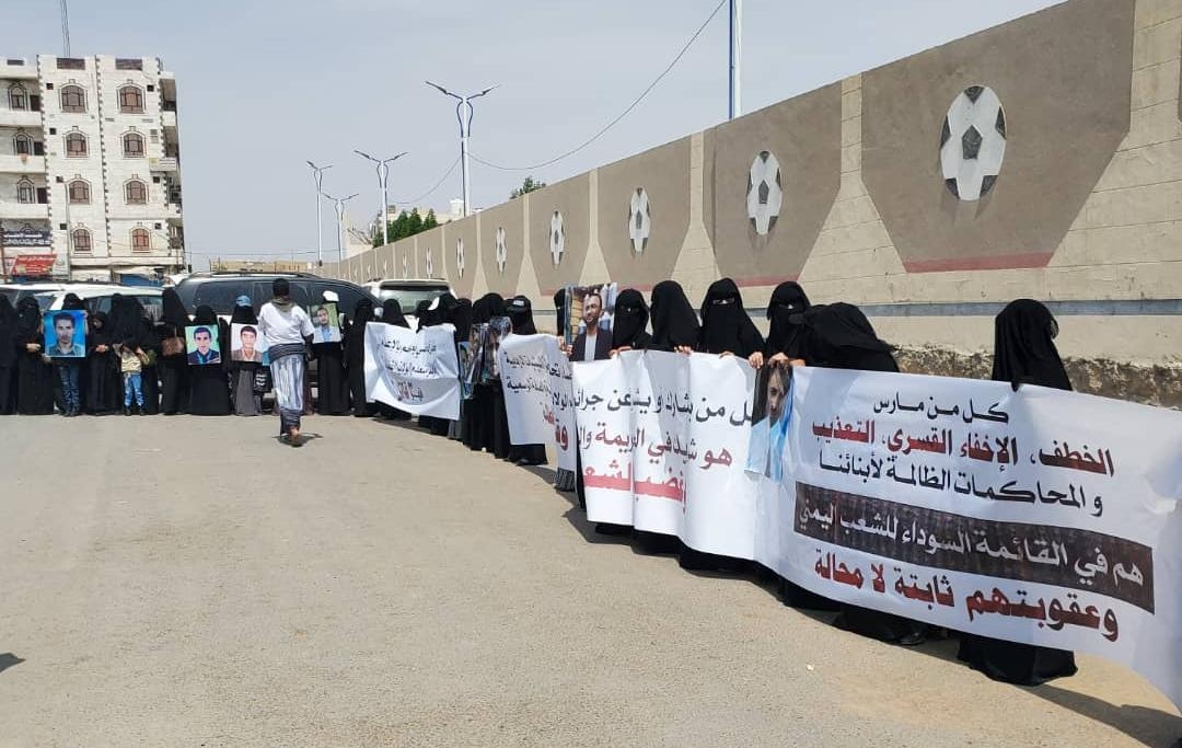 وقفة احتجاجية لأهالي المختطفين طالبوا المبعوث الأممي والحكومة وقف تدخلات الحوثي بالقضاء وترهيبهم للمختطفين