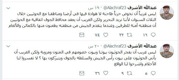 وقال الأشرف في تغريدات له على " تويتر" ليس غريباً أن نخوض حرباً طاحنة لا هوادة فيها في أرضنا ومناطقنا مع الحوثيين خلال الثلاث السنوات لأننا نريد التحرير ولكن الغريب أن يعقد محافظ الجوف اتفاقية مع الحوثيين أن منطقته آمنة للطرفين وعندما يتقدم الجيش من منطقته يطعنون منها بالكمائن والألغام.
