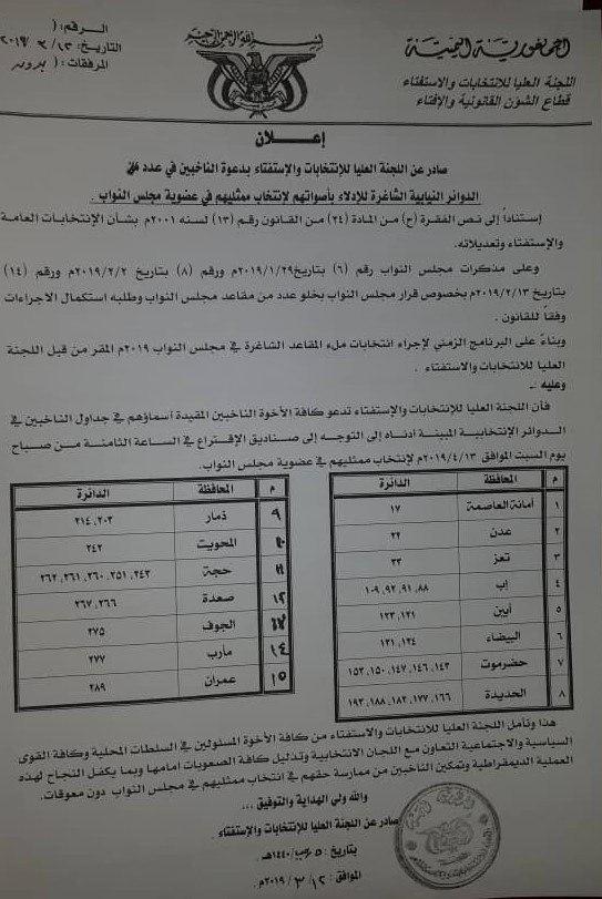 ودعت اللجنة العليا للانتخابات والاستفتاء التي تديرها جماعة الحوثي في صنعاء الناخبين في الدوائر الانتخابية الشاغرة وعددها 34 دائرة التوجه في الساعة الثامنة من صباح يوم السبت الموافق 13 إبريل 2019م إلى صناديق الاقتراع للإدلاء بأصواتهم لانتخاب ممثليهم لعضوية مجلس النواب.