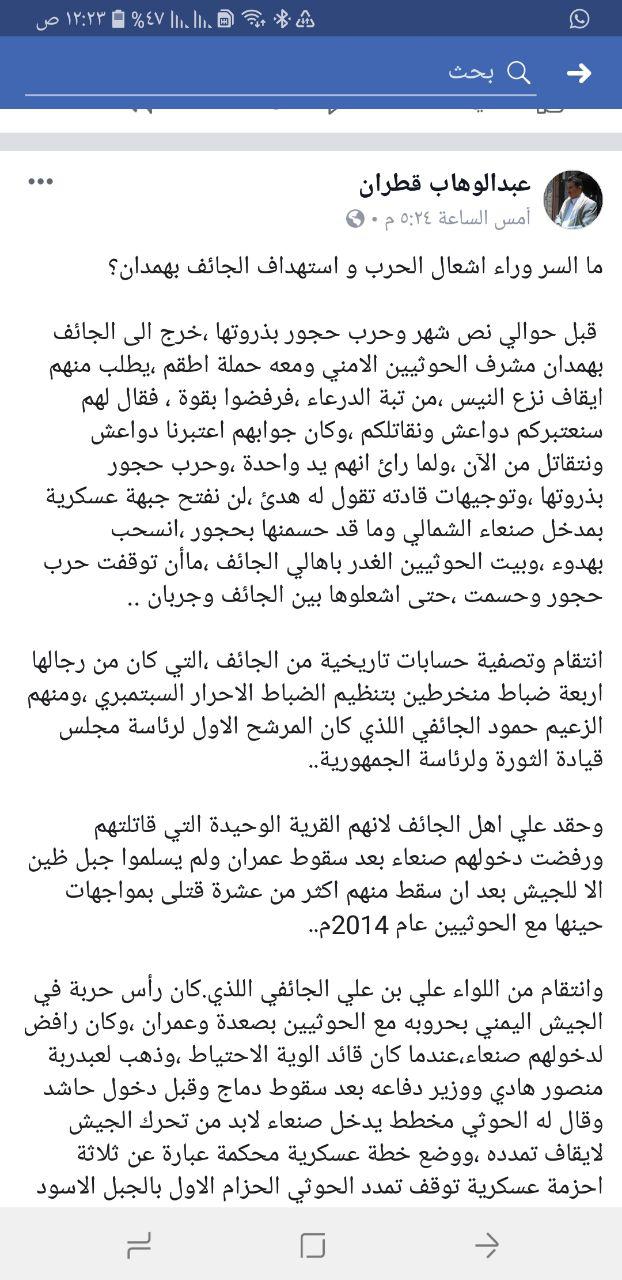 وخلص القاضي قطران إلى القول "و ما أن توقفت حرب حجور وحسمت، حتى اشعلوها بين الجائف وجربان.. انتقاما وتصفية حسابات تاريخية من الجائف التي كان من رجالها اربعة ضباط منخرطون بتنظيم الضباط الاحرار السبتمبري وحقدا على اهل الجائف لانهم القرية الوحيدة التي قاتلتهم ورفضت دخولهم صنعاء بعد سقوط عمران ولم يسلموا جبل ظين الا للجيش بعد ان سقط منهم اكثر من عشرة قتلى بمواجهات حينها مع الحوثيين عام 2014م".