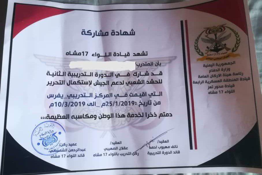 وأكدت المصادر أن عدد أفراد ميليشيا الحشد الشعبي والذين تلقوا تدريبات عسكرية بلغ 2500 فردا تم تدريبيهم في عدة معسكرات برعاية اللواء22 ميكا و17 مشاه وبإشراف مباشر من القائد العسكري لجماعة الاخوان في تعز عبده فرحان المعروف بــ”سالم”.