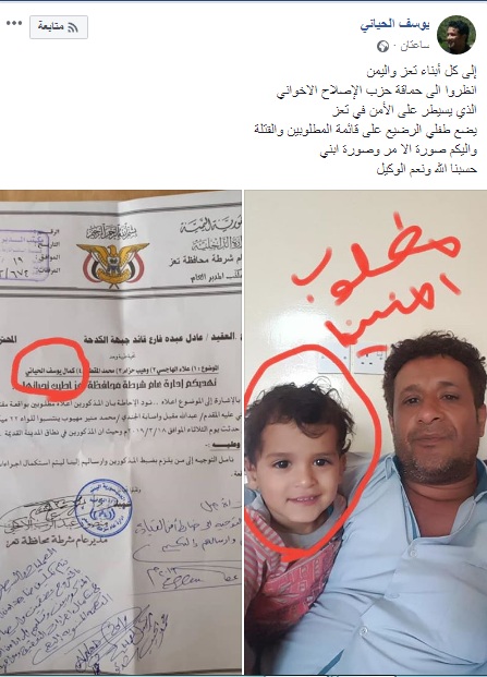 كشف أحد القيادات المحسوبة على حزب المؤتمر عن مطالبة مدير عام شرطة تعز القبض على طفله البالغ من عمر عامين باعتباره مطلوبا أمنيا.