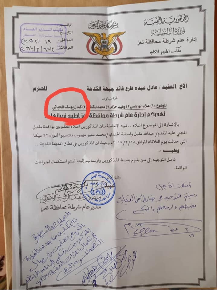وتتهم إدارة الأمن مسلحين تابعين للحياني بقتل احد ضباط اللواء 22 ميكا المقدم عبدالله مقبل هزاع المخلافي ومرافقه الجندي محمد منير، بعد اعتراضهم سيارتهما في جولة سنان وسط تعز.