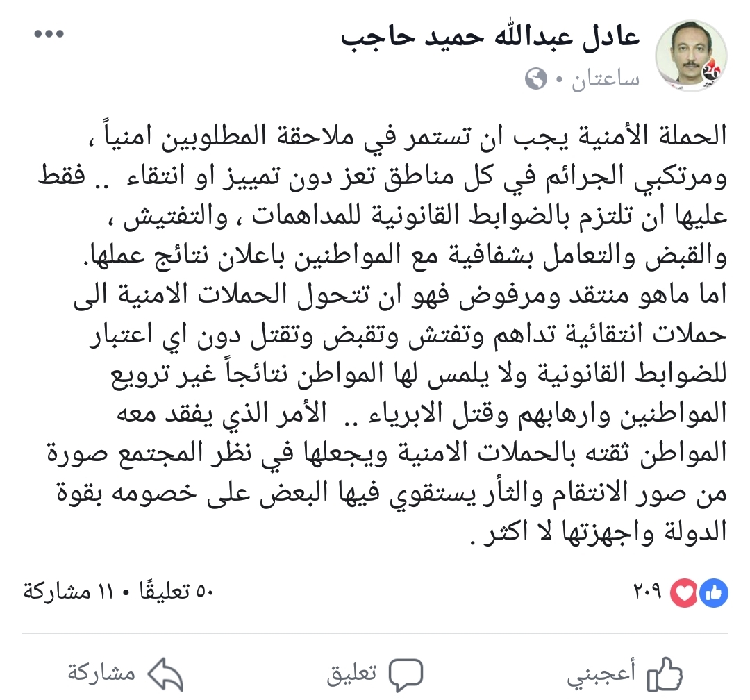 قال عادل العقيبي، رئيس فرع التنظيم الوحدوي الشعبي الناصري بتعز، إن الحملة الأمنية يجب أن تستمر في ملاحقة المطلوبين أمنياً، ومرتكبي الجرائم في كل مناطق تعز دون تمييز أو انتقاء.