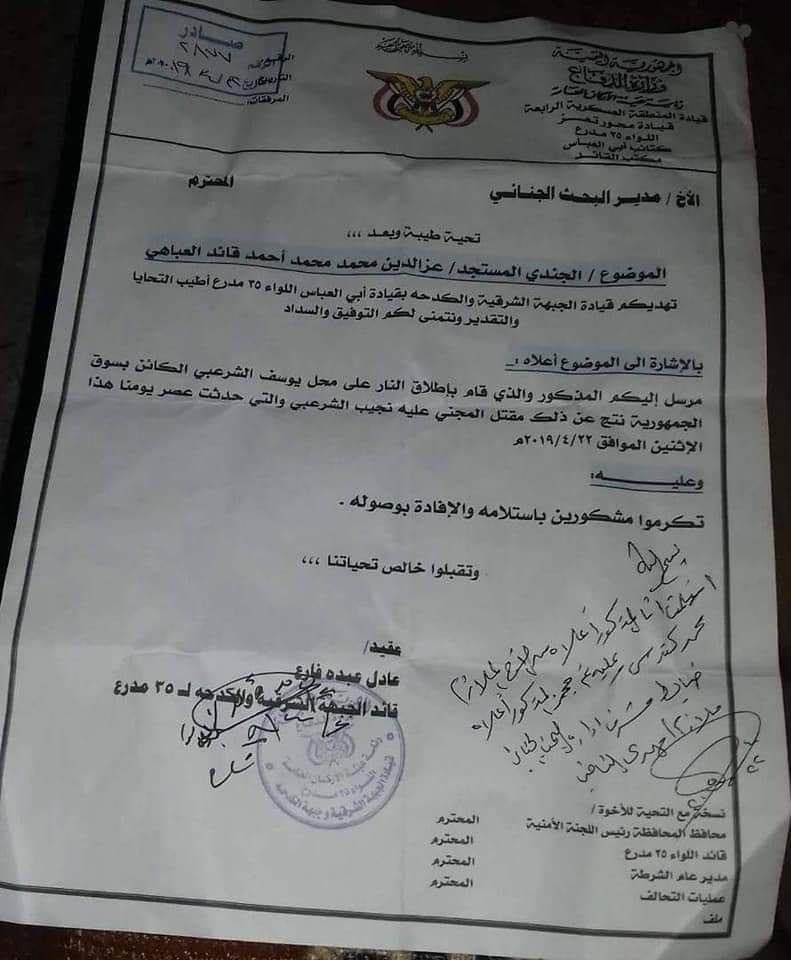 وبحسب الوثيقة فقد قام الجندي المستجد / عزالدين العباهي بإطلاق النار على محل لمواطن يدعى نجيب الشرعبي في سوق الجمهورية عصر اليوم ما أدى الى مقتله.
