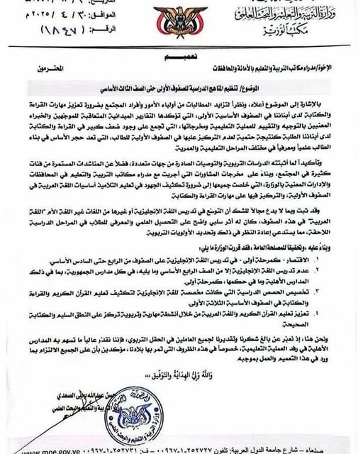 التعميم الصادر عن وزير التعليم بحكومة المليشيا الى المدراس الحكومية والخاصة ، تحدث عن تنظيم المناهج الدراسية للصفوف الأولى حتى الصف الثالث الأساسي.