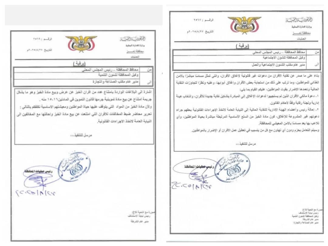 محافظ تعز يحيل الأفران المخالفة للنيابة ونقابتهم للشؤون الاجتماعية ويتوعد بإجراءات قانونية صارمة- وثيقة