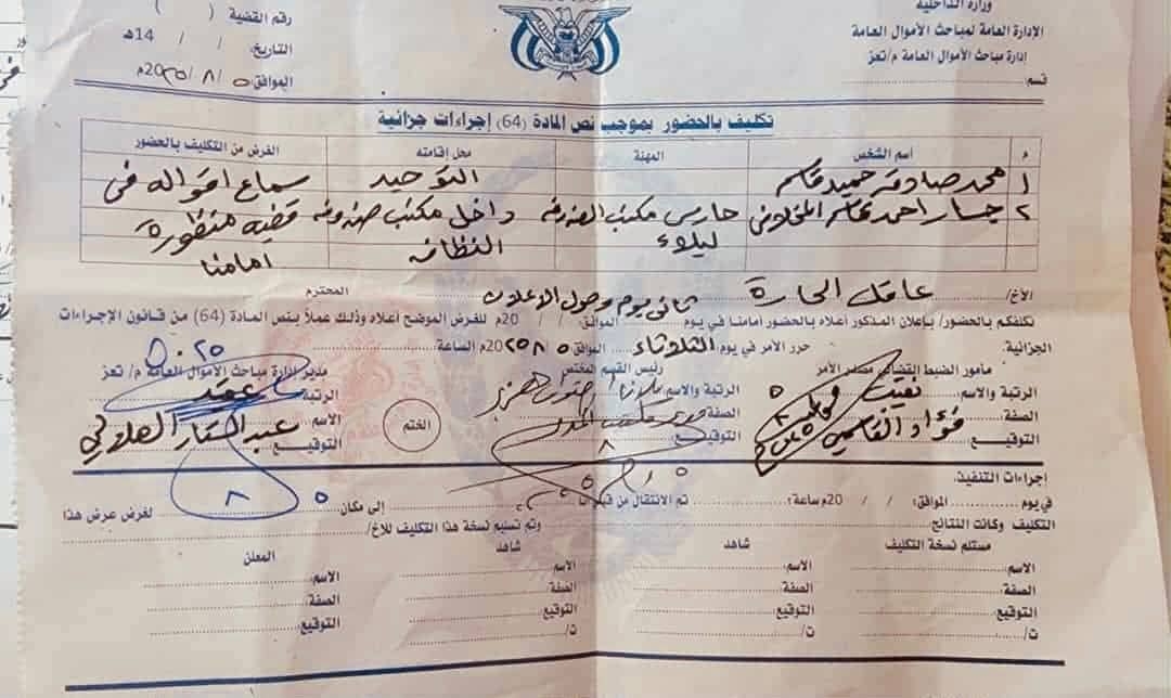 واشارت المصادر الى وثيقة احضار من النيابة العامة ضد المدعو جسار والقاتل محمد صادق المخلافي المشهور بـ "الباسق" صادرة في أغسطس الماضي على خلفية التهديد الصادر ضد الشهيدة افتهان ، دون ان يتم تنفيذ ذلك.