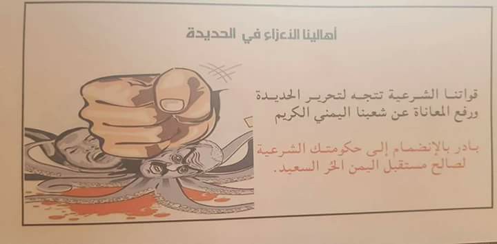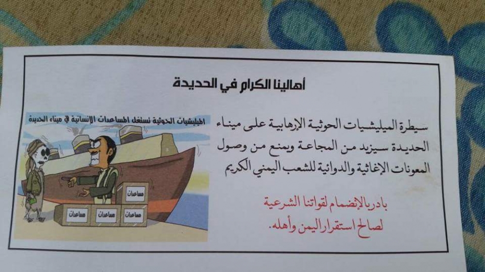 وتظهر الصور التي تداولها ناشطون على مواقع التواصل الاجتماعي مناشدات في هذه المنشورات لسكان الحديدة بالتعاون مع وقوات التحالف والانضمام لقوات الشرعية.