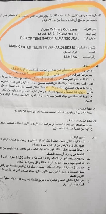 حيث نشر الصحفي صورا لإحدى الاتفاقيات التي تعقدها مصافي عدن مع تجار المشتقات النفطية ، ويوضح احد نصوصها الزام المصافي للتجار بتوريد مستحقات المصافي الى محل صرافة خاص وليس الى البنك المركزي.