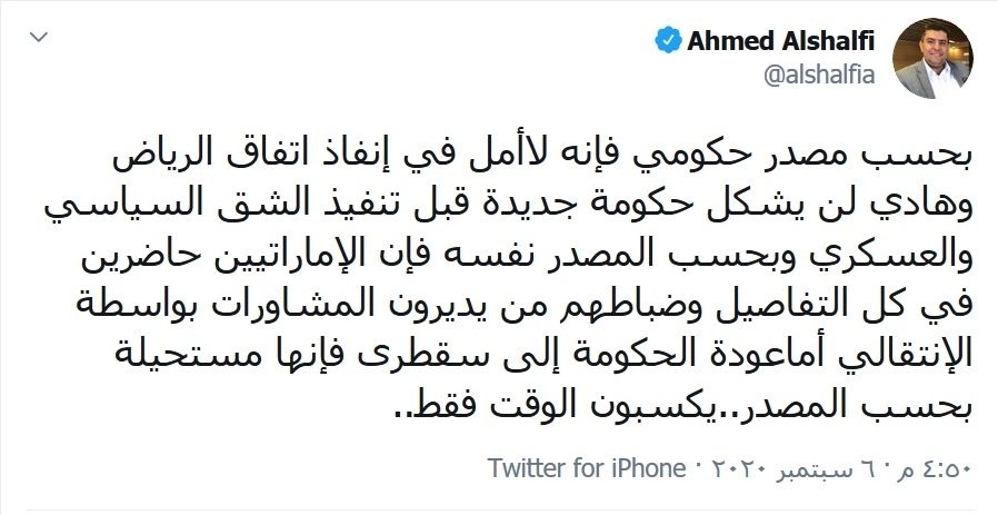 حيث نسب الشلفي الى مصدر حكومي قوله " لا أمل في إنفاذ اتفاق الرياض وهادي لن يشكل حكومة جديدة قبل تنفيذ الشق السياسي والعسكري".