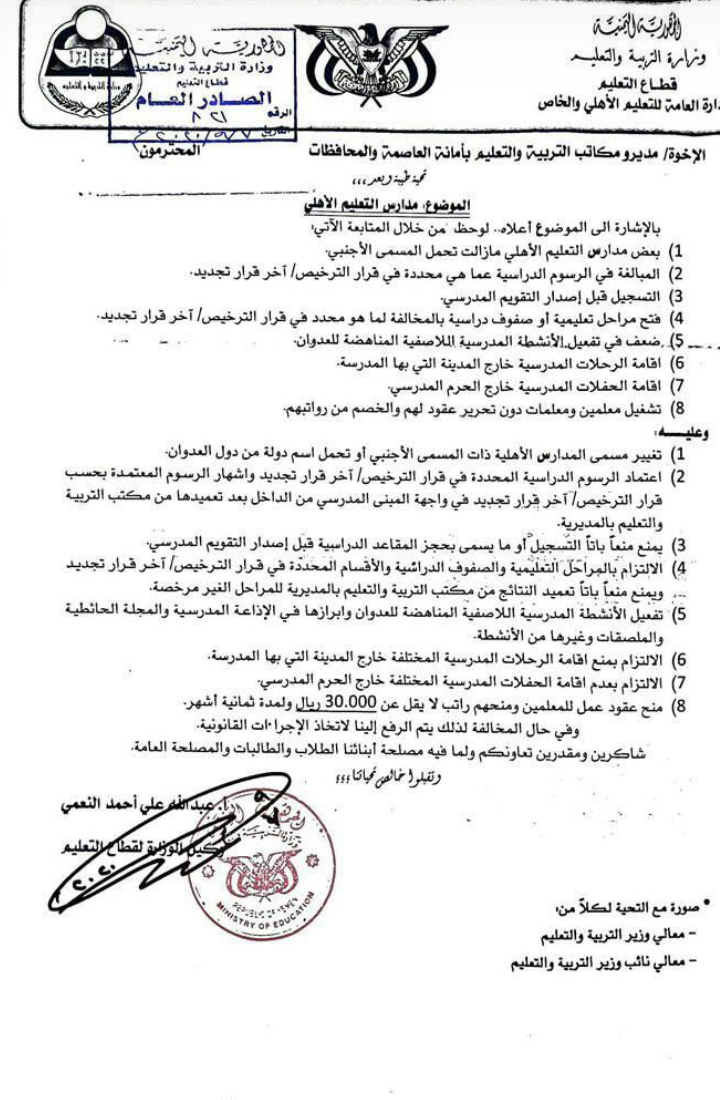 وتضمن القرار تغيّر اسماء المدارس الخاصة التي تحمل أسماء أجنبية ومنع الرحلات الطلابية خارج المدينة التي توجد بها المدرسة ومنع الحفلات خارج المدارس”، في إطار استكمال السيطرة على التعليم وأنشطته .