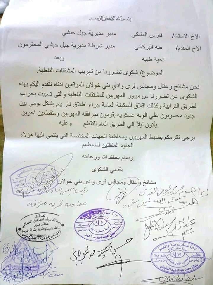 حيث وجه عقال ومشائخ عزلة وادي بنى خولان في مديرية جبل حبشي شكوى الى مدير المديرية القيادي الاخوان / فارس المليكي ، ومدير الأمن طه البركاني الذي تم فرضه بالقوة عقب الحملة العسكرية التي قادها محور تعز ضد مدير الأمن السابق العقيد توفيق الوقار مطلع أغسطس الماضي.